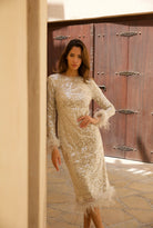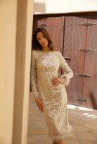 - feather trim detail on sleeves and bottom of dress