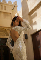 This exquisite sequin dress is perfect for making a statement. Crafted in a luxurious champagne hue with a dramatic backless design and soft feather trim, it is sure to captivate. Step into the spotlight and embrace your inner glamour.