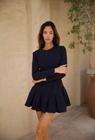 The tailored fabric gives this navy dress a classic and timeless feel. Designed with long sleeves and a back zipper, it's versatile enough to dress up or down for any occasion. You'll love how the delicate pleating adds a unique touch to this must-have dress.