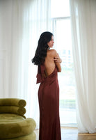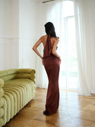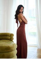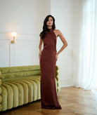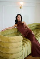 The Rosie Dress is pure elegance — cut in a rich chocolate-brown satin that drapes beautifully over the body. Designed with a halter neckline that frames the shoulders and elongates the silhouette, it skims the figure before flowing into a floor-sweeping hem.
