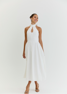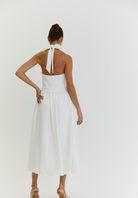 Introducing The Harper Dress, a stunning and elegant white midi dress perfect perfect for all occasions. With its graceful halter neck and low back, this dress exudes timeless sophistication and grace, making it the must have choice for any event whether it be Wimbledon to Ascot or a garden party. Perfect for strolling around city streets with trainers or dressing up for a evening with heels. Its versatility and effortless style will make you stand out in any setting.