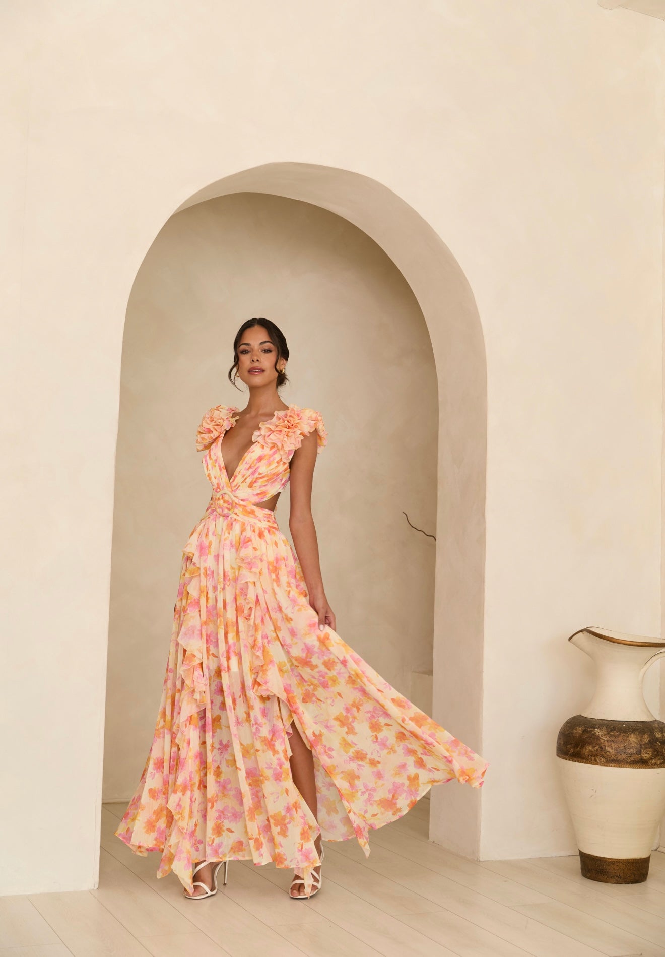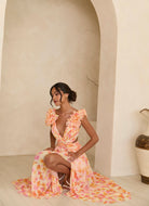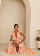Exude elegance with the Clementine Floral Maxi Dress. Crafted from vibrant floral fabric, this show-stopping maxi cascades in delightful waves of color as bright as fresh-pressed clementines. Feature your figure with a cutout detail, then finish this masterpiece with a delicate lace-up detail along the back. A stunning best-seller in a bold new colour palette, this dress is sure to turn heads.